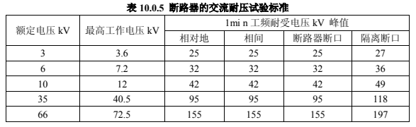 在斷路器合閘及分閘狀態(tài)下進(jìn)行交流耐壓試驗(yàn)時:當(dāng)在合閘狀態(tài)下進(jìn)行時,試驗(yàn)電壓應(yīng)符合表 10.0.5 的規(guī)定。當(dāng)在分閘狀態(tài)下進(jìn)行時,真空滅弧室斷口間的試驗(yàn)電壓應(yīng)按產(chǎn)品技術(shù)條件的規(guī)定,試驗(yàn)中不應(yīng)發(fā)生貫穿性放電。